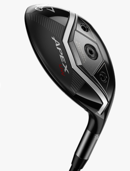 キャロウェイゴルフ APEX UW 2025年モデル フェアウェイウッドの特徴ステップ・ソールデザインで抜群の抜けの良さフェアウェイウッドとユーティリティの良い部分(フェアウェイウッドは打ち出し角とスピン量、ユーティリティは操作性)を組み合わせたクラブとして開発され、2022年1月に初代、2023年中盤に2代目が発売された「APEX UW」ですが、今回は、現在もスタッフプレーヤーやツアープロが多く使用している初代モデルをブラッシュアップしたスタイルとなりました。ほぼ2022年モデルを踏襲したヘッドシェイプは、操作性の高さを感じさせるコンパクトなもので、ソールには当時初登場となったステップ・ソールデザインも採用。抜群の抜けの良さを発揮します。UWバージョンとして設計されているAi APEX FACEフェースには、「Ai APEX FACE」が導入されています。これは、ELYTEシリーズで登場したAi 10x FACEのAPEX UWバージョンとも言えるもので、このモデルのターゲットとなるスキルの高いプレーヤーのリアルなデータを生かしながらAiが設計した最新のフェースです。コントロールポイントが従来のAI設計フェースよりも大幅に増えており、打点位置ごとに最適なスピン、打ち出し角へと補正。優れた強度を持ち、反発性能が高いことで知られるマレージング鋼C300をフェースカップ構造にて採用。驚異のボールスピードを実現しながらも、前作よりもバラつきの少ない着弾範囲を実現します。クラウンにはカーボンを使い、ホーゼルも長めにほかにも、2021年モデルから進化した部分があります。まず構えたときに目に入るのが、クラウンをフェース側と後部に分けるように入っているラインで、カーボン製のクラウンが採用されていることがすぐにわかります。素材は、トライアクシャル・カーボンとなっています。また、ホーゼルは2023年モデルよりも、やや長く設計されています。これらは、後述の重量配分の最適化に関係している部分です。タングステン・スピードウェーブをヘッド内に搭載ソール前方には、スクリューウェイト(5g)が搭載されていますが、その両側に2つのビスがあることからもわかるように、ELYTEシリーズのフェアウェイウッドで登場したタングステン・スピードウェーブも内蔵されています。ヘッド内で浮いたようなスタイルで搭載されているもので、フェースのたわみを損なうことなく、トップに近いインパクトであってもしっかりとボールを高く遠くへ打ち出すことを可能にしています。なお、このタングステン・スピードウェーブは、単に重心を低くしてボールの上がりやすさややさしさを求めているものではありません。プロや上級者が求める弾道、スピン、コントロール性を備えるべく、前述のカーボン製クラウンや長めのホーゼルとバランスを取りながら、最適な重量配分を追求したものとなっています。スクリューウェイトは、プレーヤーごとに、さらに好みのフィーリングへと調整できるようにする役割を担っています。番手間で0.75インチの差をつけたクラブ長さ新しい「APEX UW」は前作同様、ロフト17度、19度、21度、23度を用意しています。ただし、前作などでは、2度刻みのロフト差により、距離のピッチがはっきり出にくかった面もあったということで、クラブ長さが変更されています。前作の17度と19度はいずれも41インチでしたが、17度を41.75インチ、19度を41インチに設定。同様に、40.5インチだった21度は40.25インチ、40.0インチだった23度は39.5インチです。つまり、番手間の差は0.75インチずつになっているということになります。