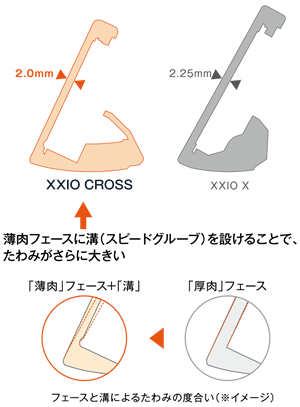 ■圧倒的な高初速設計XXIO史上最も薄く設計されたチタンフェースの反発力に加え、フェース裏面の下部からトウに刻んだ「スピードグルーブ」がたわみを生み出し、ユーザー打点をカバーする広範囲な反発エリアを実現。 |