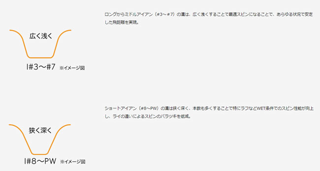 精度を高めたスピンコントロール性能最適なスピンを生み出し、状況に応じたパフォーマンスを発揮する「番手別溝設計」。