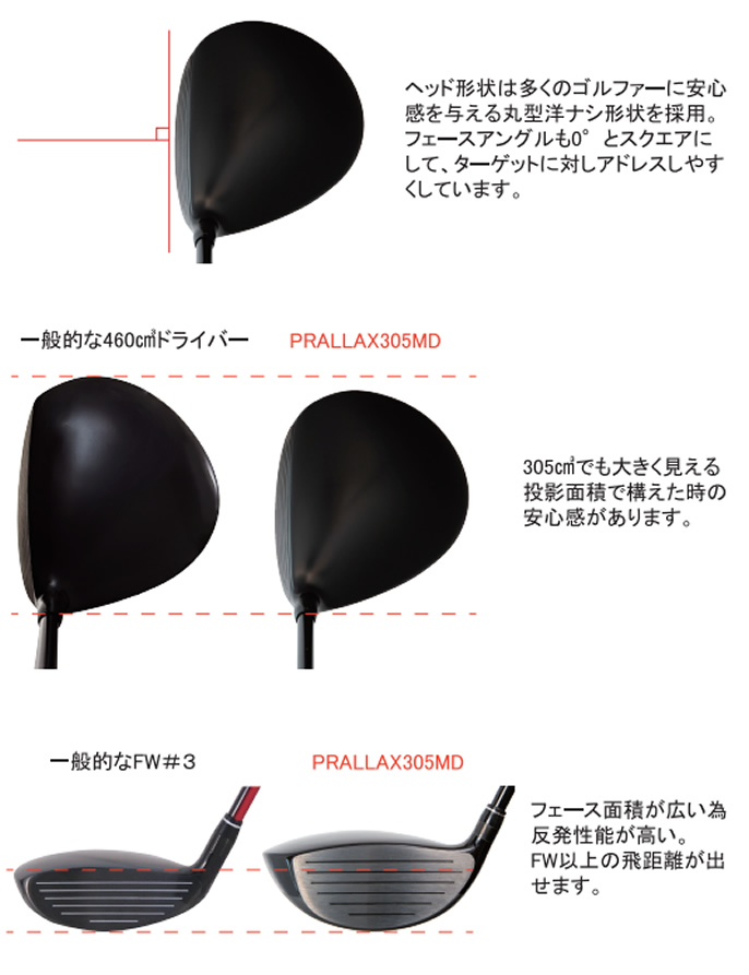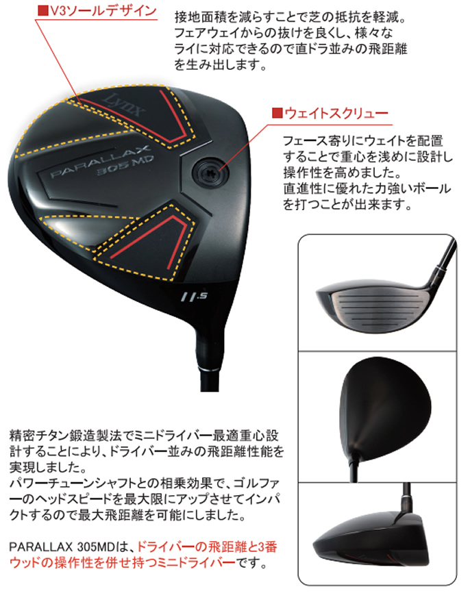 LYNX PARALLAX 305MD ミニドライバーの特徴操作性と飛距離性能を追求した305cm3ミニドライバーです。 最適重量設計とV3ソールデザインにより、ティーアップはもちろん直打ちでも圧倒的な飛距離と操作性を体感していただけます。