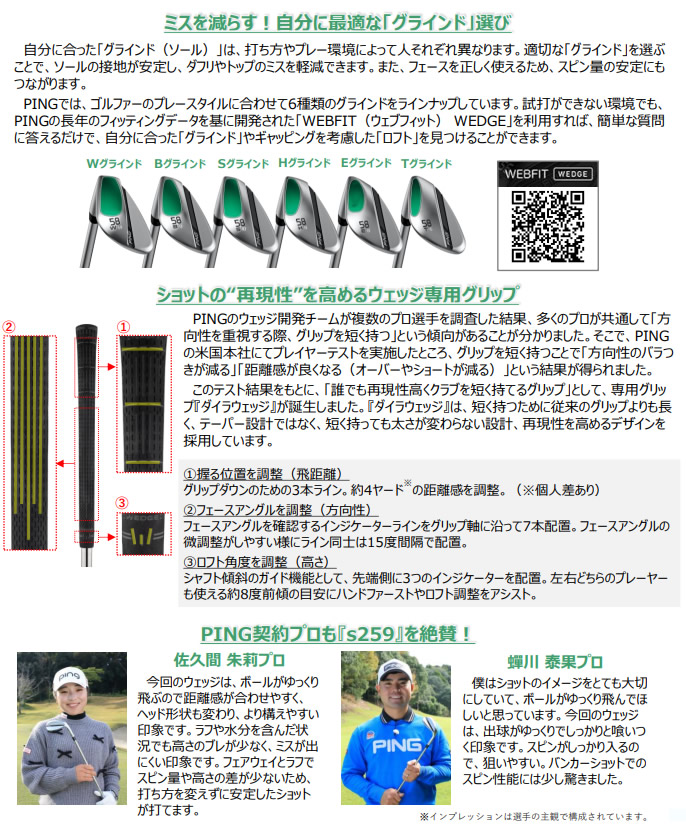 ピン s259 ウェッジの特徴いつでも「強スピン」インパクトには必ず芝や水、土が入り込む。 そんな悪条件(リアルコンディション)こそ、 「s259」の強スピンが輝く舞台。 いつでも、どこでも、確実に止める。