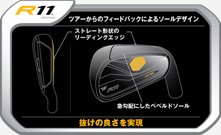 ≫ 各番手に最適な性能を実現するフローデザイン ≫ すぐれたスピン性能と操作性を発揮 ≫ 適切な重心位置で打感も向上 ※「R11 アイアン」は2010年1月1日から主要なプロフェッショナルツアー(PGAツアー国際連盟に加盟しているツアー、女子ツアー、およびその他同等の組織) において適用されるUSGA、R&Aによって定められた新しい規則に則った溝(グルーブ)を採用しています。