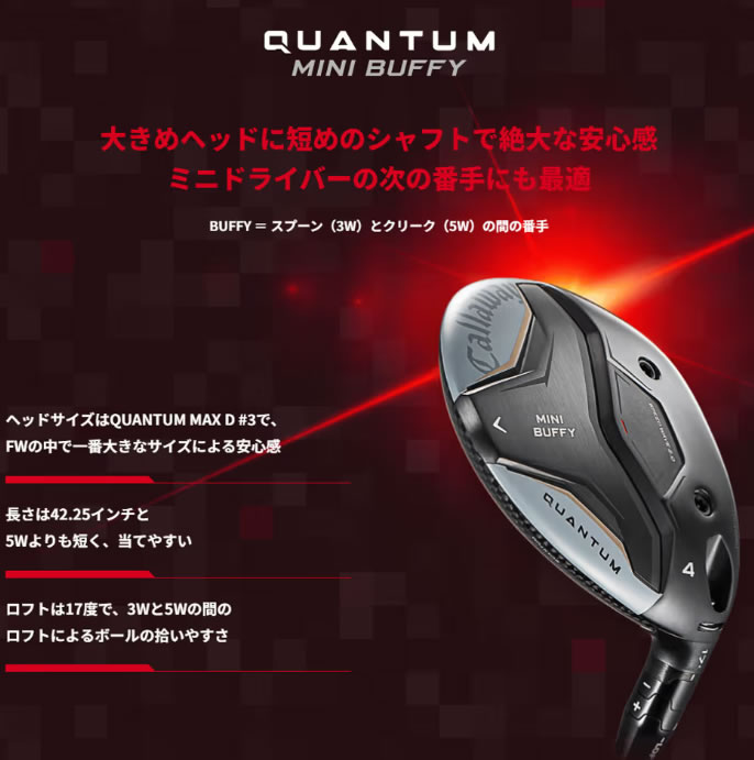 キャロウェイゴルフ QUANTUM MINI BUFFY フェアウェイウッドの特徴アイアンのように操って攻めていける性能を求めて「QUANTUM MINI SPINNERフェアウェイウッド」は、西村優菜プロの要望をもとに開発された、ドローボールが打てる操作性とスピン性能に優れたショートウッドです。飛距離より精度を重視する西村プロは、ショートウッドにアイアンのようなコントロール性と、グリーンで止まる弾道を求めていました。本モデルは、高打ち出し設計と十分なスピン量を両立。ハイブリッドやミドル-ロングアイアンでは得にくい高さとスピンを確保し、キャリーでグリーンを狙ってもしっかり止まるショットを可能にします。 さらに、ボールをしっかりつかまえつつバックスピンを生み出すことで、アイアンのような操作性を維持しながら、ピンをデッドに狙える攻撃的なショートウッドに仕上がっています。![]() 西村優菜プロのデータをもとにしてAIがフェースを設計「QUANTUM MINI SPINNERフェアウェイウッド」は、西村優菜プロのスイングデータをもとにAIがフェース設計を行っています。これにより、QUANTUMの他のフェアウェイウッドよりスピンを増やす設計がされています。ボールは途中から急激に上昇し、頂点から急角度でグリーンにソフトに着弾。ランを最小限にし、グリーンをとらえることができる弾道を生み出します。 ヘッドラインアップはW#7、W#9、W#11の3種類になっています。MAXフェアウェイウッドよりも半インチ短いクラブ長さヘッドは、操作性の高さを感じさせる洋ナシ型の小ぶりなデザインです。フェースはディープで重心が高く、スピン量の増加にも貢献しています。クラブ長さは各番手ともQUANTUM MAXフェアウェイウッドより半インチ短く設定されており、操作性が向上するとともに、インパクトの安定性も高められています。 ホーゼルは3つの番手すべてで接着型を採用しています。![]() 最新の三角形型をしたステップ・ソールデザインも導入ソールには、2025年ELYTEから改良された新しいステップ・ソールデザインを採用しています。以前はステップ中央が台形型でしたが、今回は三角形に近い形状に進化。 これにより、アドレス時の安定感と地面からの抜けの良さがさらに向上しています。W#7、W#9ではソールにカーボンを使用ヘッドラインアップはW#7、W#9、W#11の3種類です。ソールに使われている素材にも注目です。 ヘッドサイズが小さく、重量の影響が少ないW#11ではステンレススチールが採用されています。一方、W#7とW#9ではカーボンを使用しており、高重心化とスピン量の増加に貢献しています。 なお、クラウンはすべての番手でステンレススチール製です。 さらに、ソール前方には約7gのスクリューウェイトが装着されており、フェースコントロールのしやすさを高めています。