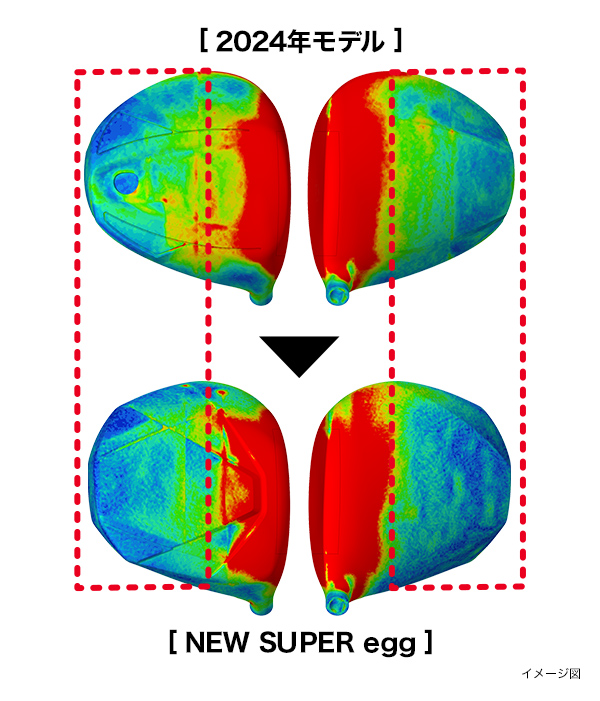 プロギア SUPER egg 高反発 2026年モデル ドライバー の特徴SUPER egg史上最高の反発性能を実現。PRGR独自のβチタンUカップフェースに加え、高反発をさらに高める六角ヘキサボディデザインで飛びの可能性を徹底追及。 高反発を超えた、新・高反発で、ぶっ飛ばす。![]() ![]() 六角ボディで、剛性を高め、インパクト時における無駄なボディ変形を抑制。 フェース付近にたわみを集中し、エネルギー効率がアップ。 ![]() 冷間曲げ加工を施すことで、βチタンDAT55G+の高強度&低弾性特性を生かしたまま、高い反発性と耐久性を両立させたカップフェース。 ![]() 周辺薄肉エリアを前作比130%に拡大 ![]() 周辺薄肉エリアを拡げ、フェースのたわみを大きくする専用設計により耐久限界の高反発を追求。 フェースが大きく・広くたわむ=反発が高く・エリアが広い。 SUPER egg 史上最高の反発性能を実現。 ![]() 前作よりシャローヘッド化。 やや重心距離を短く、重心角を大きくしたことで、つかまりがいい。 ヘッド質量を上げたことで、さらなる初速・飛距離アップを実現。 (ヘッド質量:前作比5gアップ)