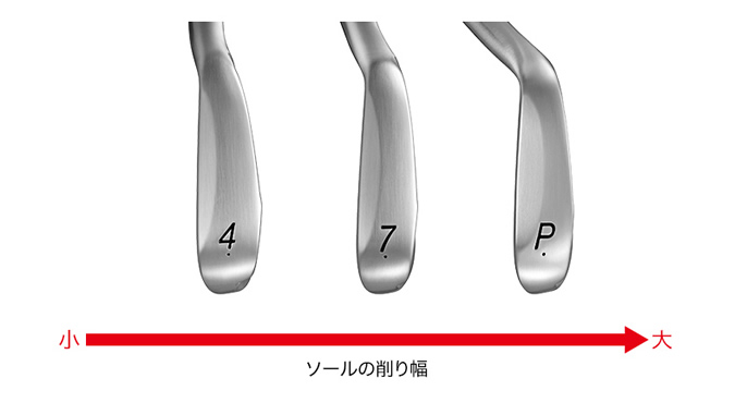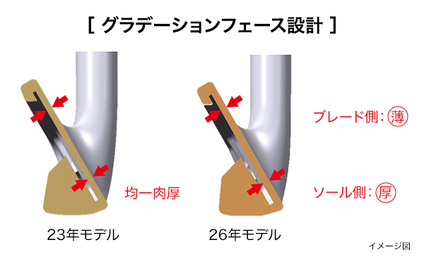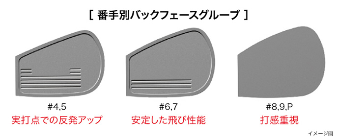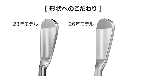 プロギア プロギアアイアンズ 02 2026年モデル アイアンの特徴王道を行く、操作性、安定性、高弾道。 心地いい打感が、全身を駆け抜ける。02IRONは、誰の手にもやさしく心地いい、操作×安定性のバランスにこだわった、THEセンタースペックだ。重心点を限りなくフェースセンターへ配置、打点と球筋のイメージを高いレベルで一致させた。 美しさとやさしさにも、究極のバランスを改めて追求。 番手別に性能の狙いをつきつめた、バックフェースグルーブ設計。 ![]() 通常アイアンショットはハンドファーストに打つのが基本であり、特にショート番手にかけて、その度合いは強くなる傾向がある(より立てて打っている)。 すると、おのずとバンス角が小さく(効かなく)なり、リーディングエッジが地面に刺さりやすい状態となる。 ![]() ![]() 番手ごとにソールのリーディング側の削り幅をフローさせることにより、全番手でリーディングエッジが刺さりにくく、かつ抜けの良い、安定したボールコンタクトが可能となった。 ![]() ソール側にかけて徐々にフェースを厚くすることで 低重心化とインパクト部分の厚肉化によるソフトな打感を実現。 ![]() 狙いの性能を達成すべく、フェース裏溝の本数・配置を最適化した 「番手別バックフェースグルーブ」を搭載。 ![]() 重心点をフェースセンター付近に配置 打点と球筋のイメージが高いレベルで一致。 ![]() ・FPを大きくし、ストレートなリーディングに ・スコアラインの位置を調整しフェースの見え方を改善