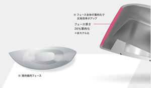 高強度のC300マレージング鋼と薄肉フェース設計により、反発性能が前モデル比で10%向上。フェース全体の反発効率が高まり、飛距離アップを実現します。 |